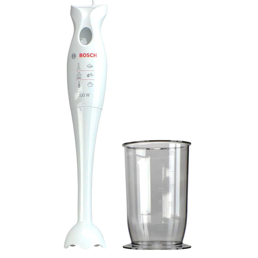 Puissance en Watts : 300 W TYPO Puissance en watts (PEM) 300 Pied plastique : oui Anneau de suspension : non Vitesses : 12 500 tours par minute Pied compatible lave-vaisselle : oui Bol gradue : oui Vitesse : 1 Accessoires : bol mixeur Dispo pcs detachees donnee fournisseur : 7 ans Garantie : 2 ans , Pièces , Main d’oeuvre TYPO Mixeur TYPO Pied compatible lave-vaisselle TYPO Pied plastique TYPO Pied detachable TYPO Bol plastique Pied plastique amovible résistant à la chaleur 180°C Bol mixeur Poignée ergonomique Un mixeur plongeant de qualité Le mixeur plongeant BOSCH MSM6B150 se distingue par ses finitions de qualité. Le pied en plastique est amovible et résiste à la chaleur jusqu’à 180 °C. Vous pouvez donc l’utiliser pour la préparation de vos soupes et veloutés, avant de le nettoyer facilement en le passant sous l’eau chaude ou au lave-vaisselle. Ce mixeur plongeant est livré avec un bol gradué qui vous permettra de réaliser aisément différentes recettes, comme la mayonnaise ou la compote de pommes. Ce modèle peut être complété par un autre jeu de lames, un fouet ou un mini robot qui le transforme en hachoir à fines herbes. Une esthétique sobre et classique Ce mixeur plongeant blanc possède un coloris classique et facile à assortir avec d’autres appareils de cuisine. Compact, il se range aisément dans un placard et se fait oublier jusqu’à ce que vous en ayez besoin. Pratique, ce mixeur plongeant est doté de lames antiprojections qui évitent la projection de liquide chaud pendant …